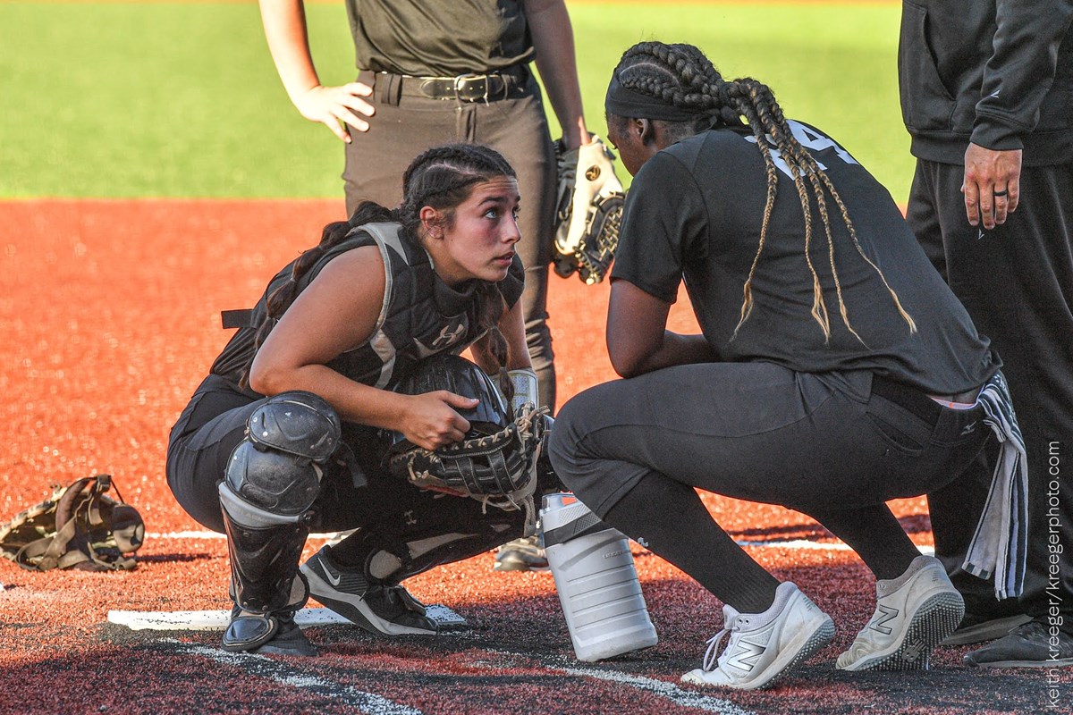 Topeka junior catcher Alesia Alvarez talks with senior pitcher Nija Canady on the mound after Canady stops to drink water during the Class 6A softball championship game.